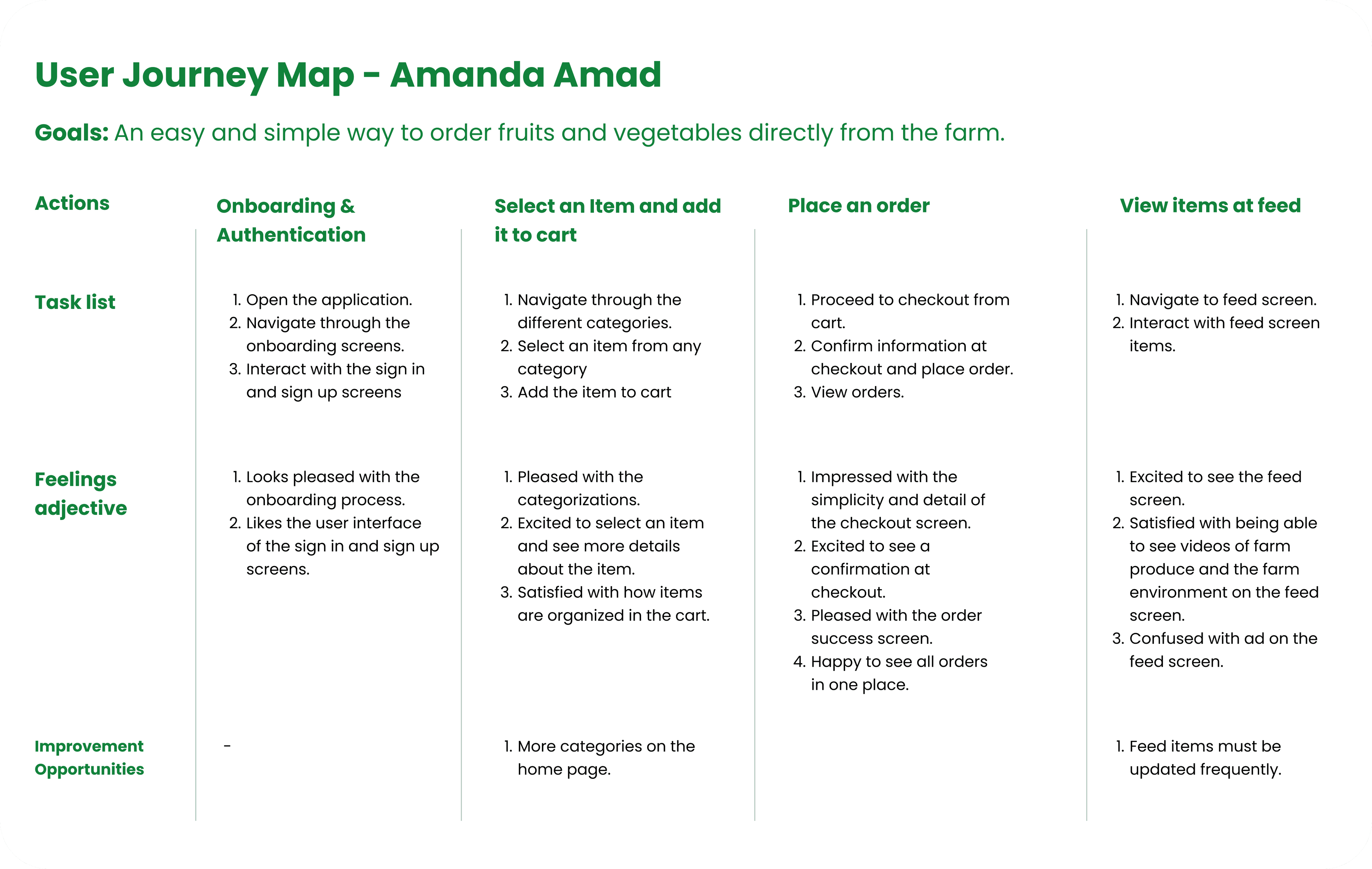 User Journey Map I used the future-state mapping approach to prepare a user journey map for a user (Amanda Amad) who wants to order farm produce in an easy and convinient way, without visiting the farm in person. Mapping Amanda's journey revealed how helpful it would be for users to have access to a dedicated Joenel Farms Ecommerce application.