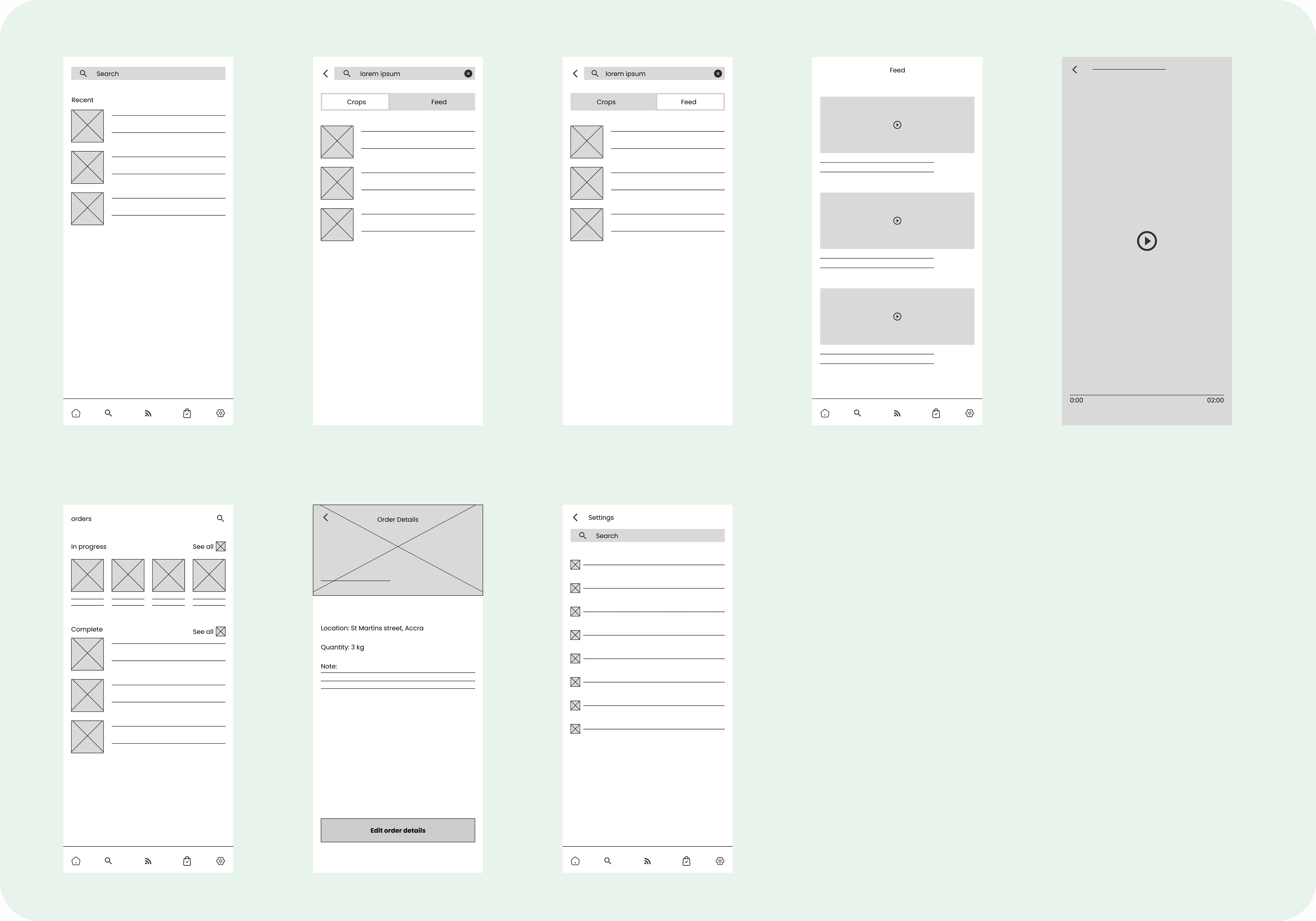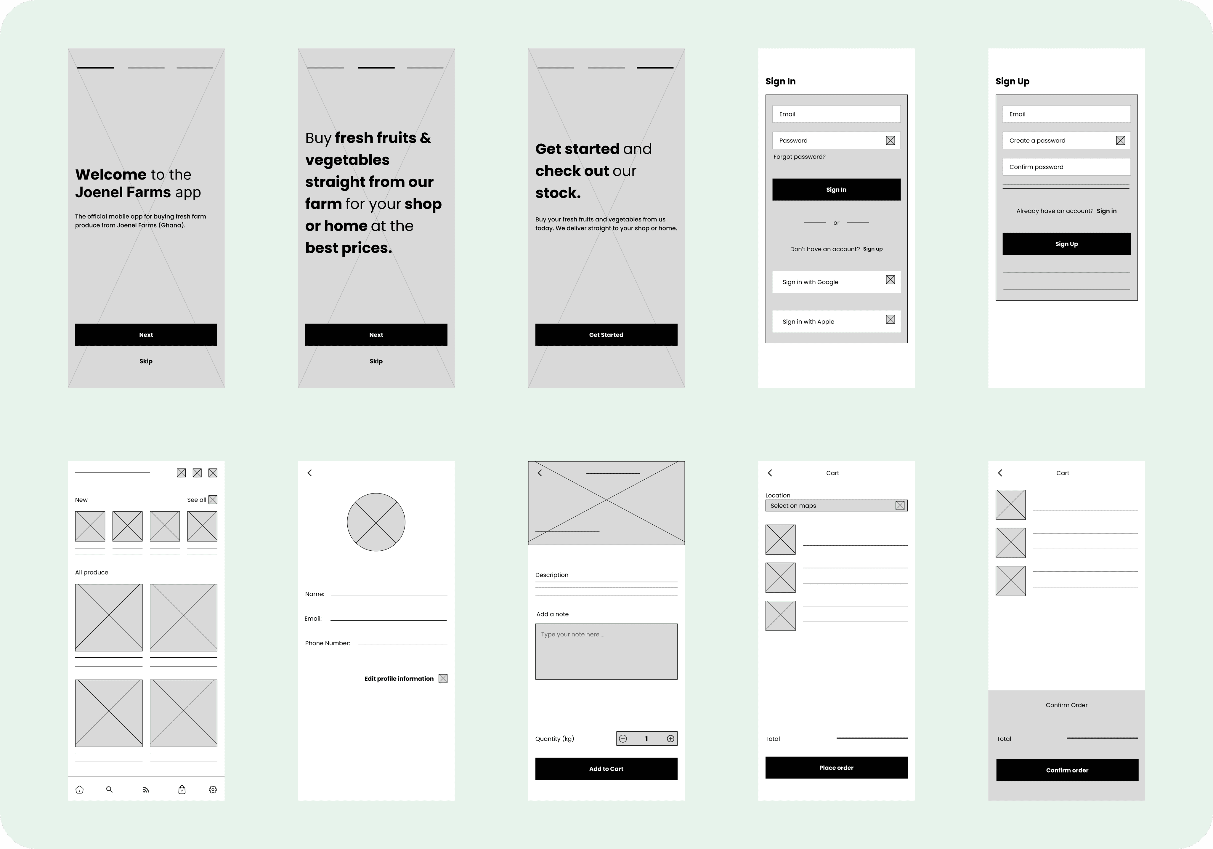 Low fidelity Prototype When I completed the digital wireframes, I generated a low-fidelity prototype. Since the main user flow was centered ordering farm produce from the app, I used this prototype for usability testing.