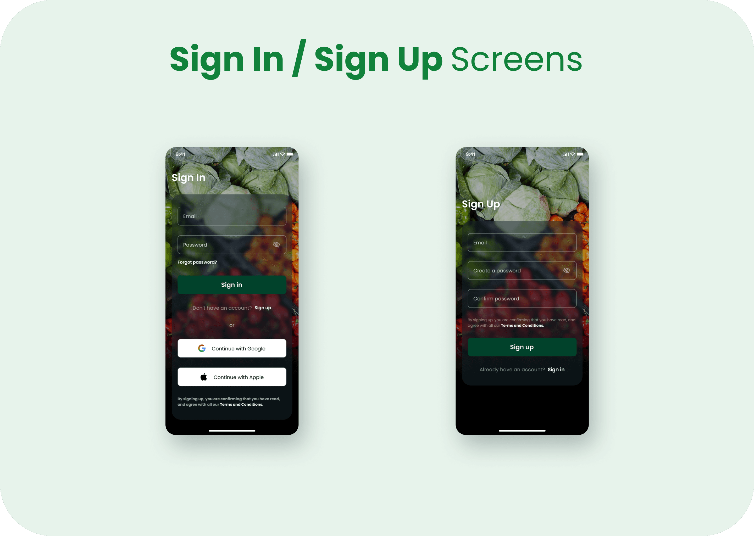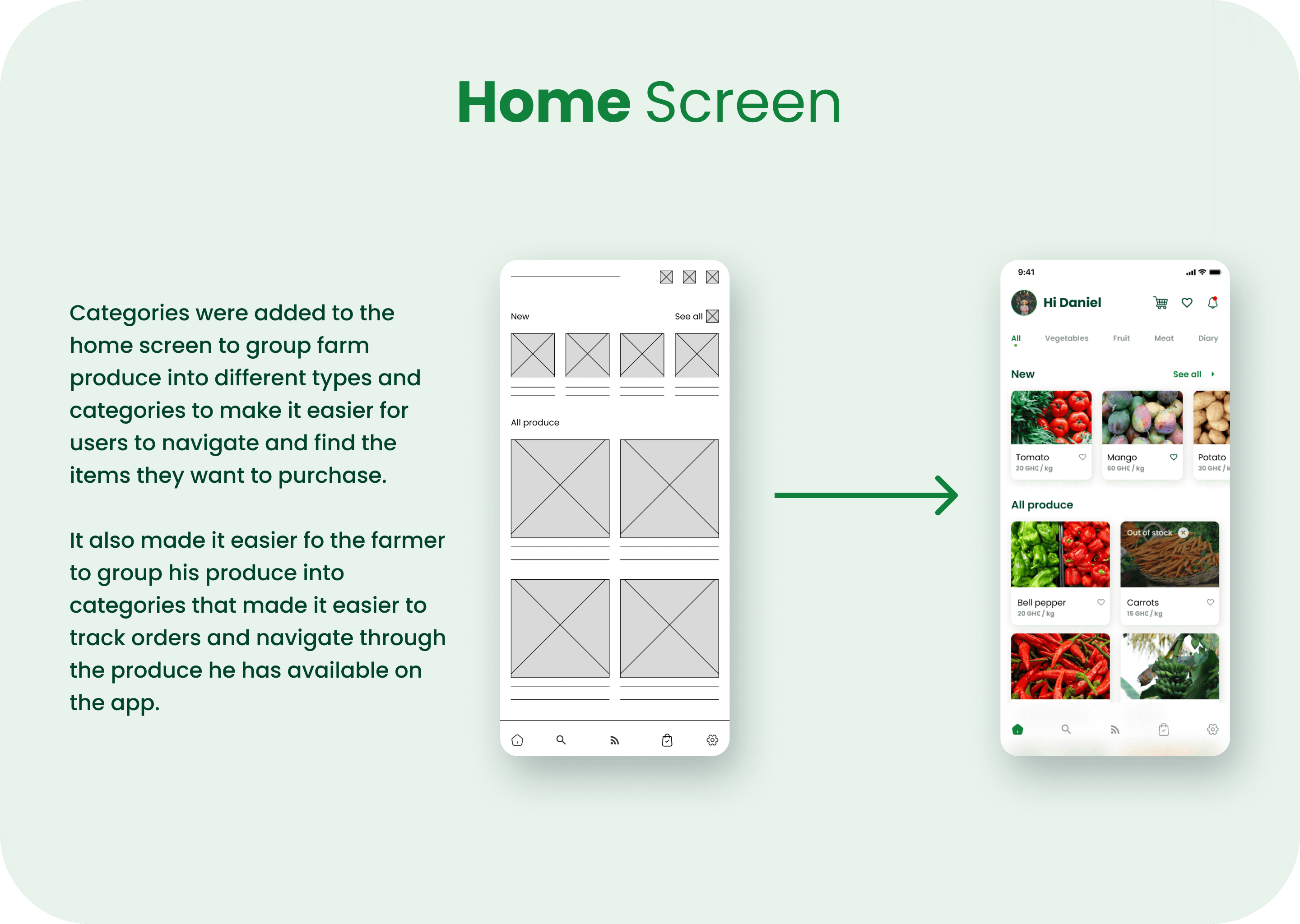 Project Goals 1. Create a user friendly onboarding process 2. Design a cohesive interface for both tech savy users, and users with a poor tech background. 3. Design an interface in a way that makes it easy for users to navigate and easily find different categories of produce. 4. Design an intereface that makes the products the focus