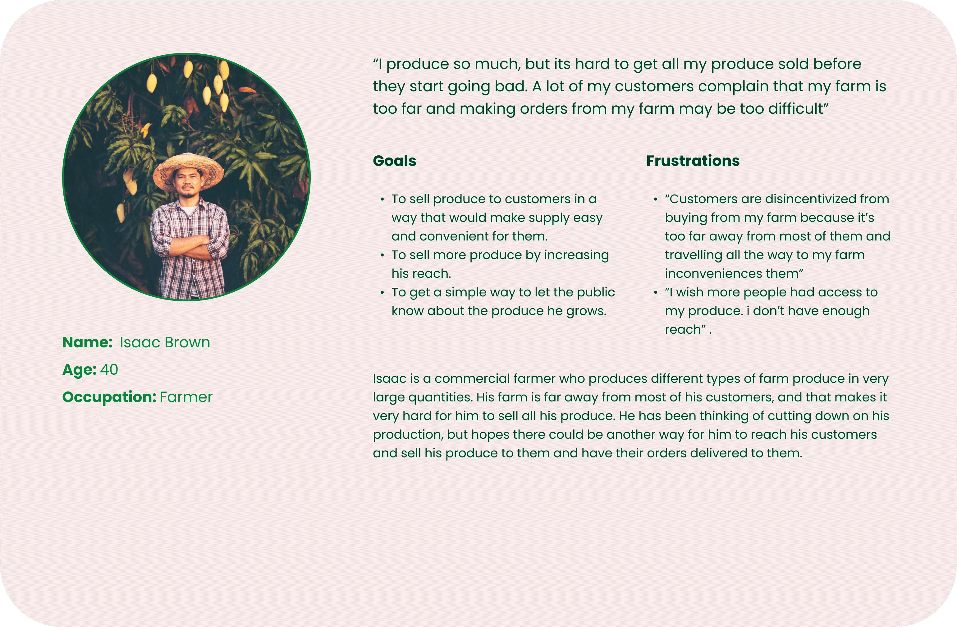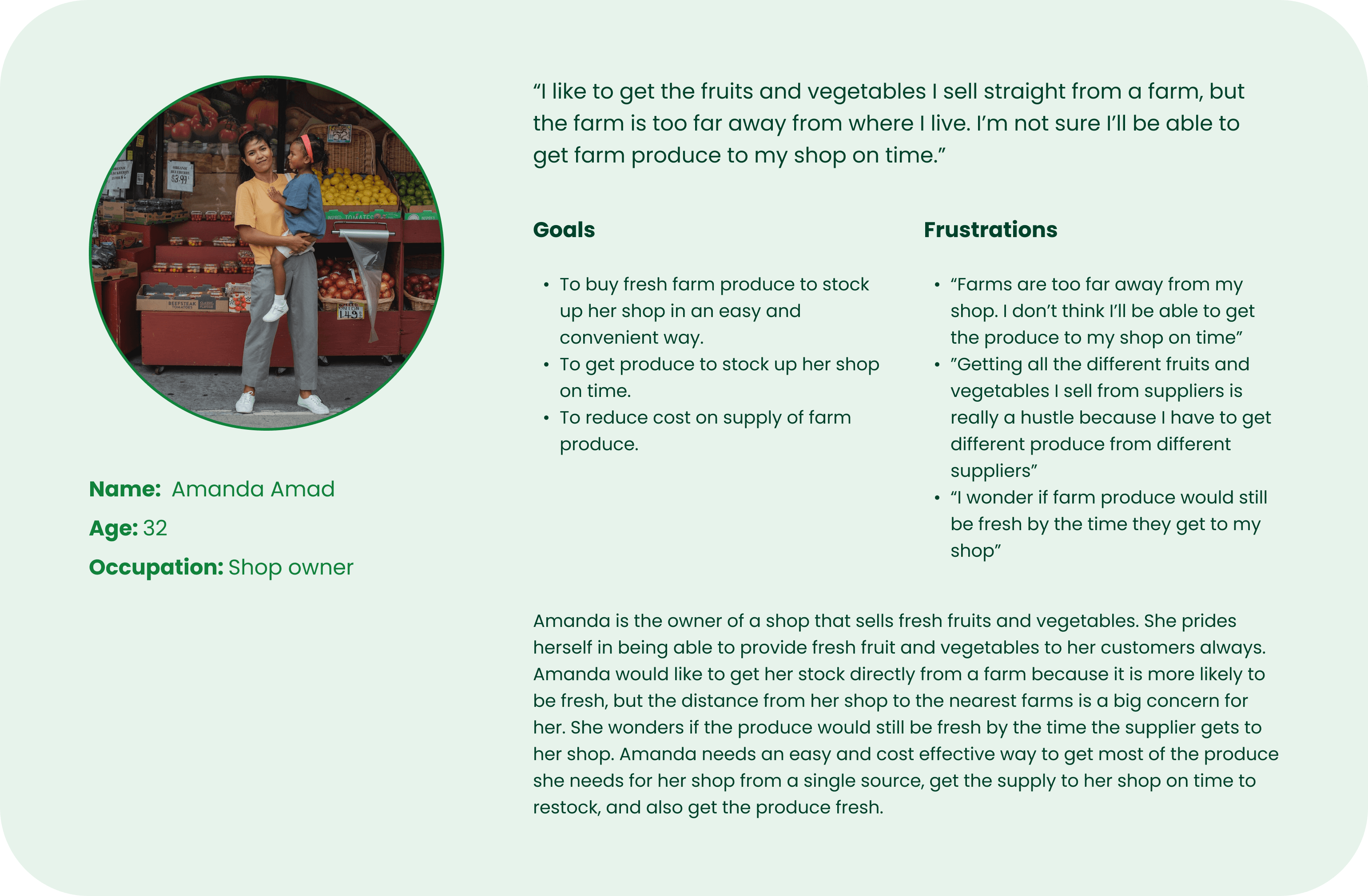 Pain points 1. Getting farm produce directly from the source can be very difficult because farms are usually very far away in rural areas. This makes it very inconvinient to for customers to comute to the farm to buy produce. 2. Fruits and vegetables are sometimes not fresh when they are bought from the shops. They are far more likely to be fresh if they came from the farm directly. 3. Farm produce become way more costly when they are bought from shops. They cost less when they are purchased right from the farm.