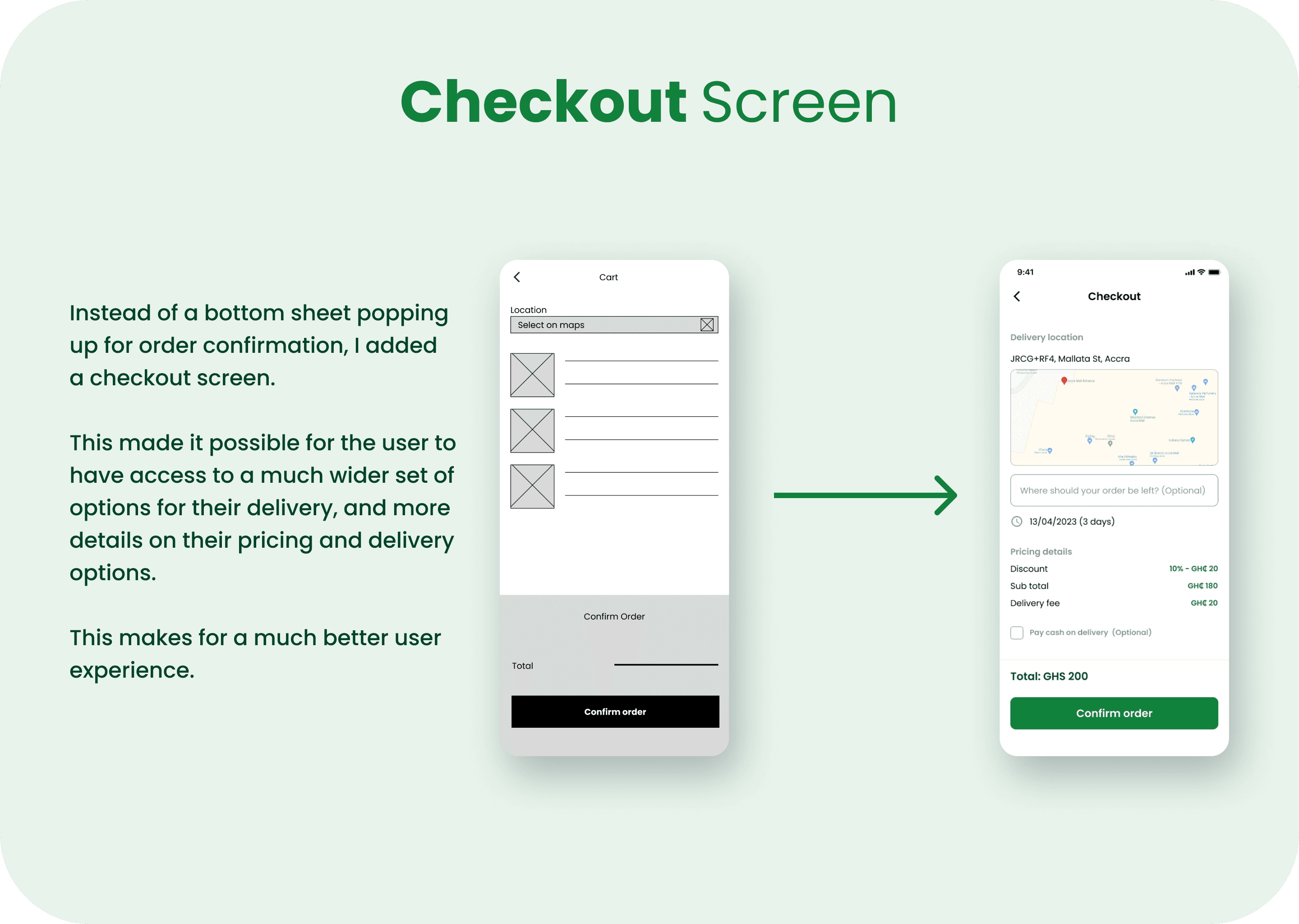 Usability Studies I conducted usability studies. One with the low fidelity prtotypes to inform design decisions with regards to the form and functionality of the app, and one with high fidelity prototypes to reveal further aspects of the design that needed to be refined. Findings 1. Users want to find items they want easily. 2. Users want easy navigation through the app. 3. Users want a map interface to choose their location. 4. Users want to be able to edit their order.
