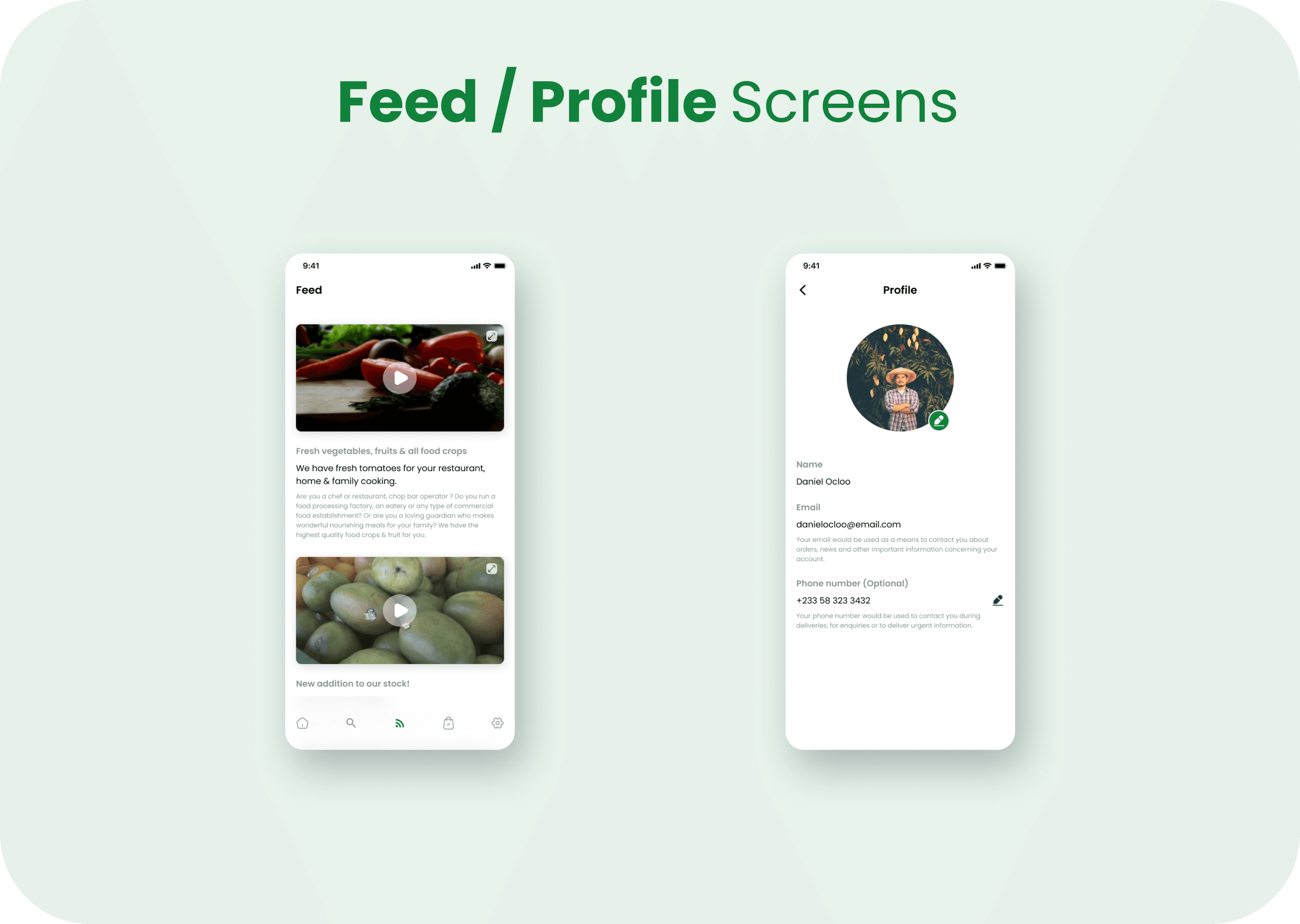 Accessibility considerations 1. Make images accessible for screen readers by adding alternative text, thus users with visual impairments can have access to the content. 2. Used detailed images for farm produce tp help users understand what each item is. 3. Used descriptive text and videos at the feed screen so that users can see how farm produce actually looks.
