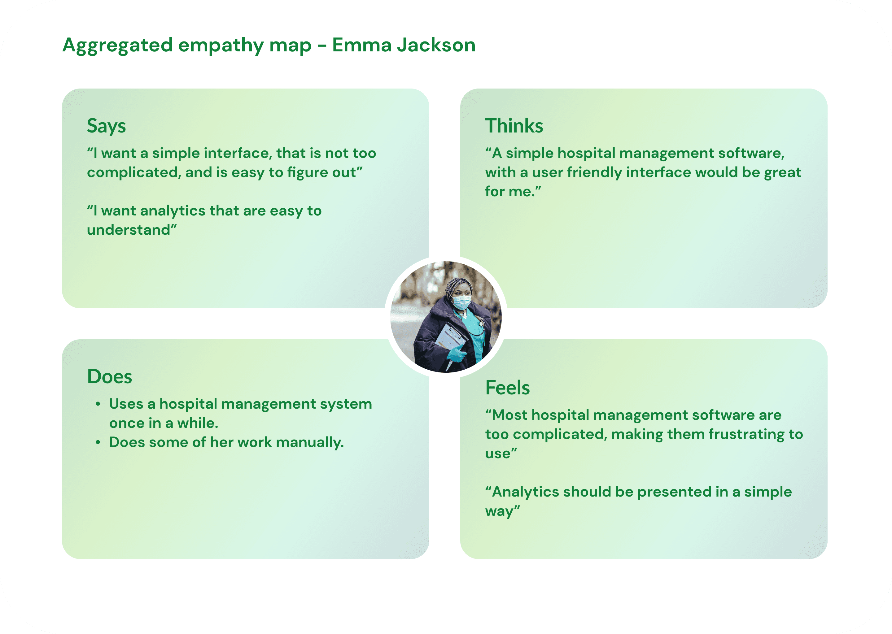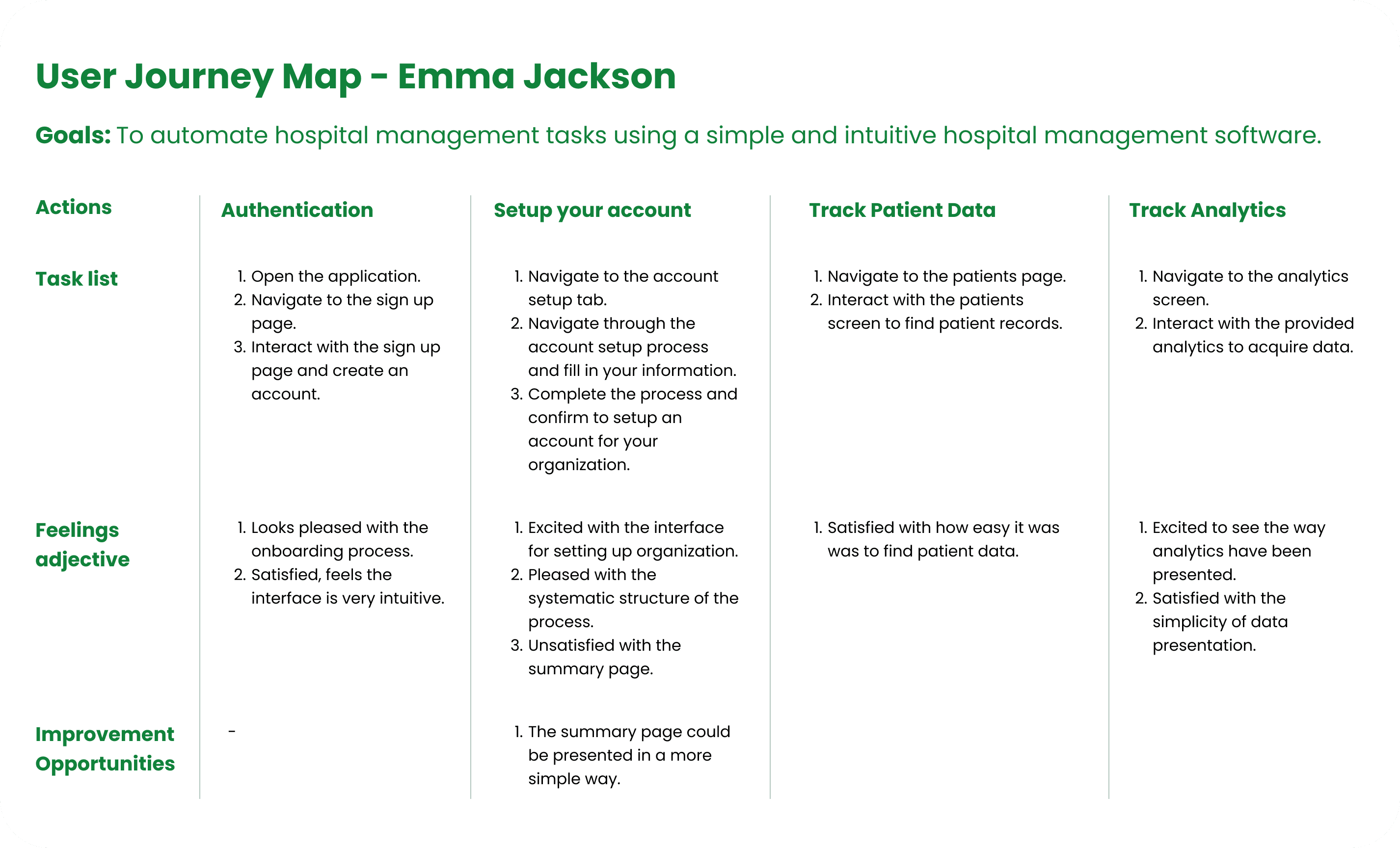User Journey Map I used the future-state mapping approach to prepare a user journey map for a user (Emma Jackson), a hospital manager who wants to automate the tasks she performs in her job. Being able to get a reliable, user-friendly hospital management software would go a long way to make her work faster. The user journey map below depicts the effect the software I designed would have on users like Emma.