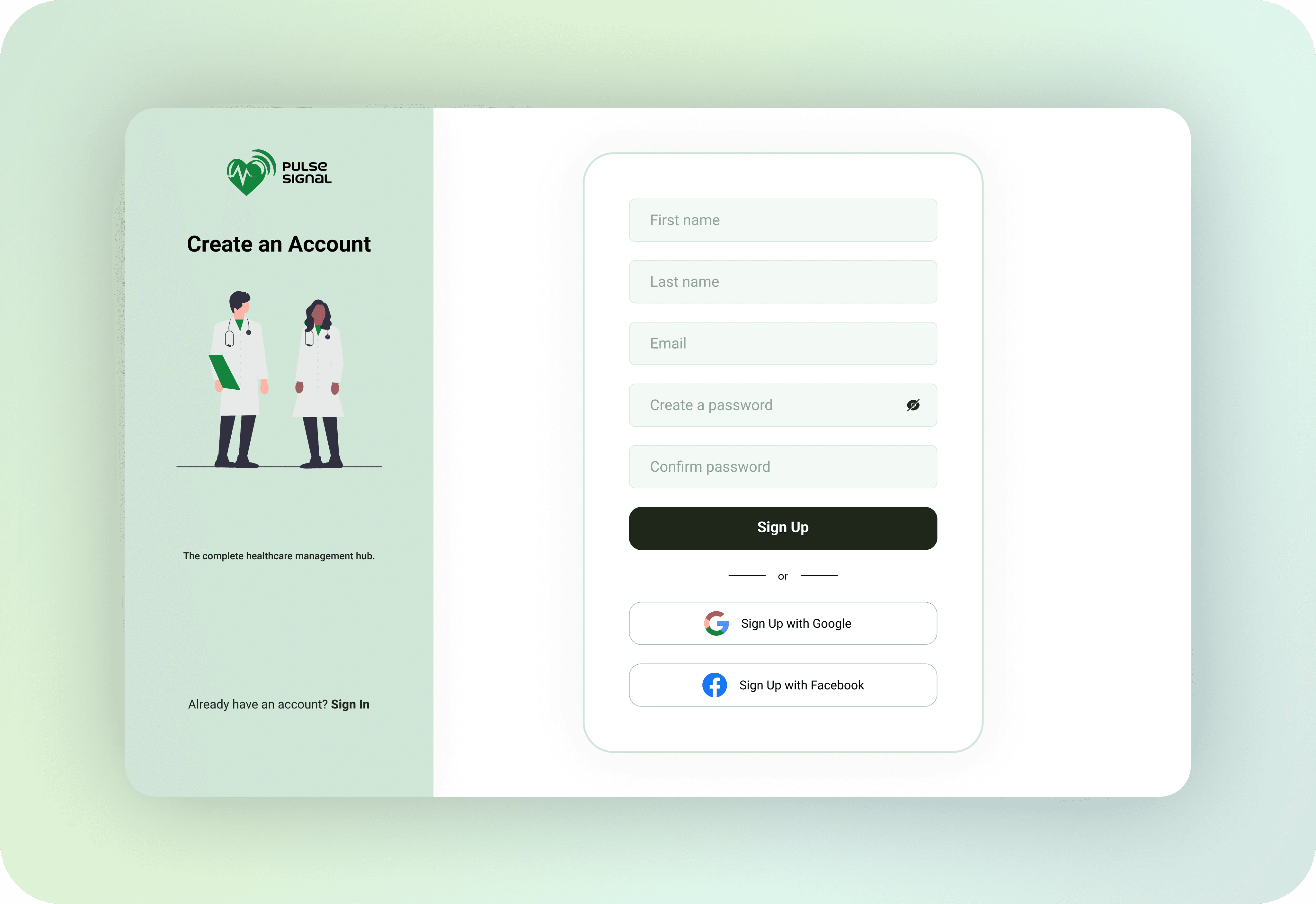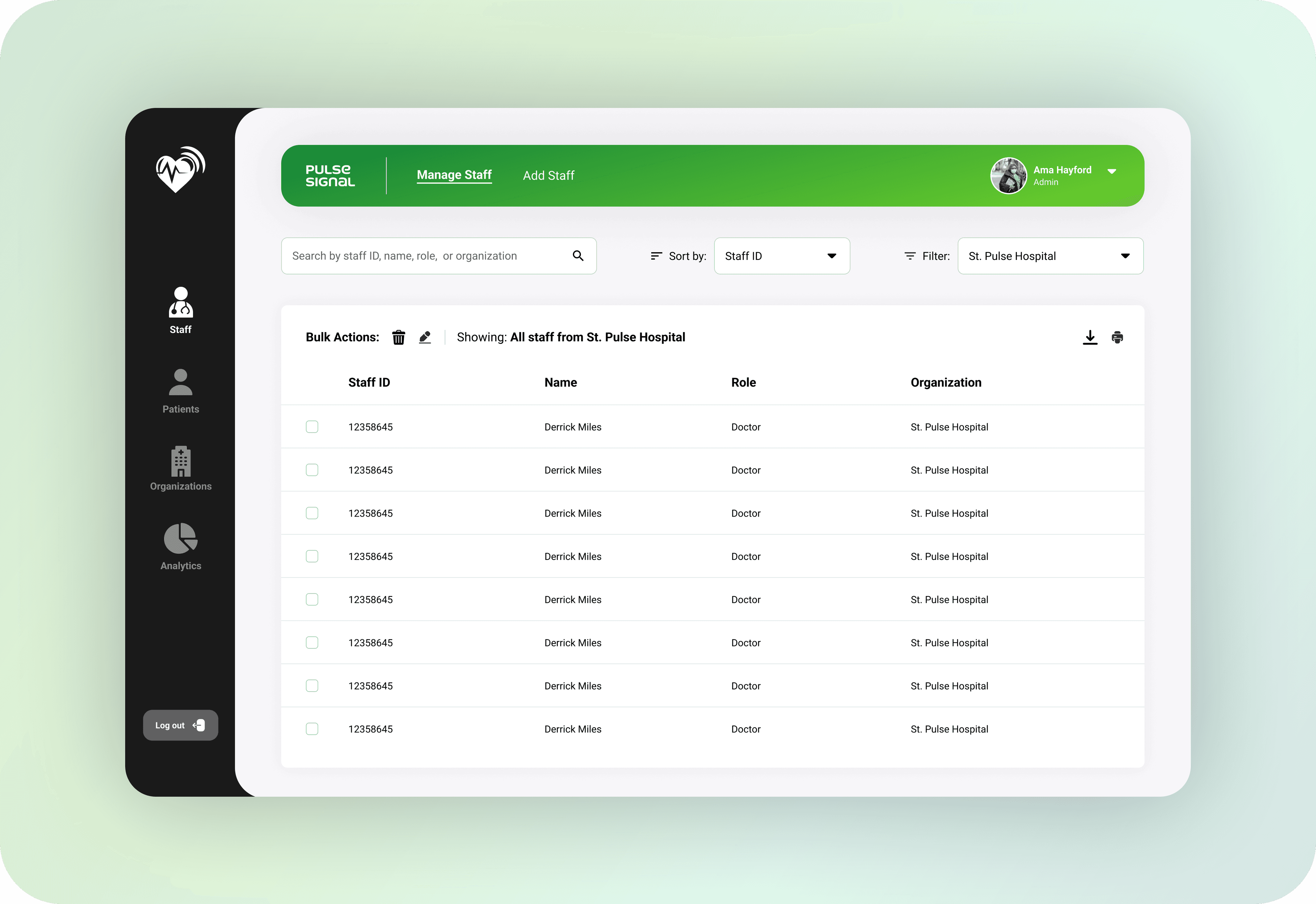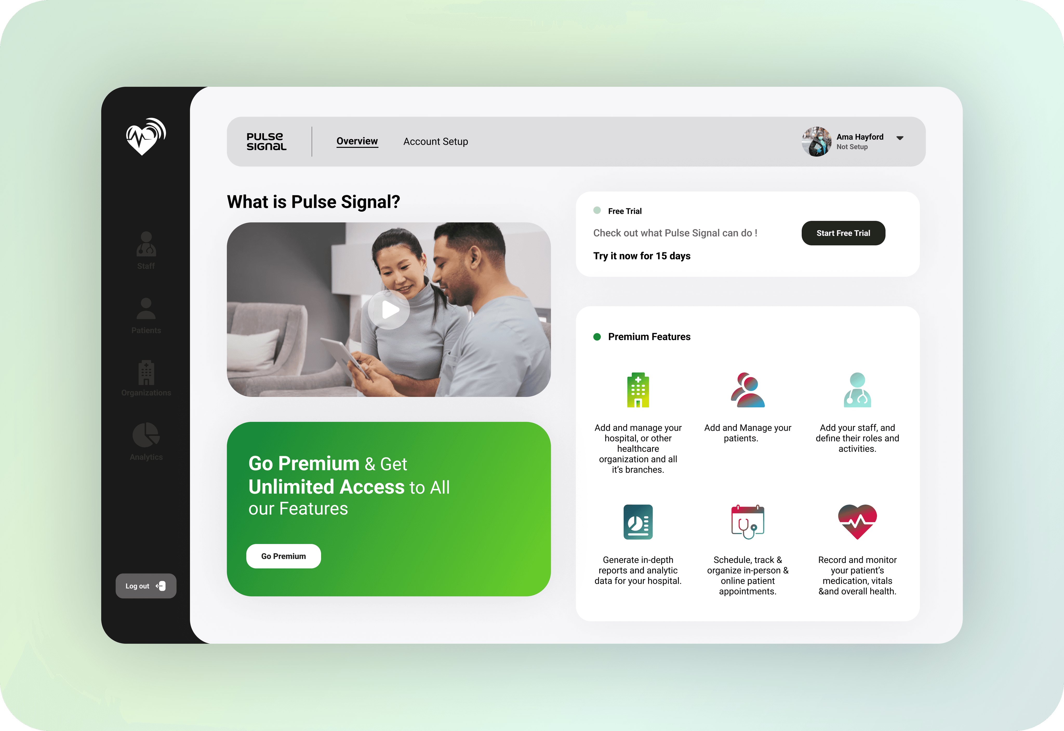 Pulse Signals is a web/desktop application designed to simplify hospital management by providing a user-friendly interface for hospital administrators, doctors, nurses, and other healthcare professionals. The application allows users to access patient information, manage appointments, track medical inventory, and much more. The goal of this project is to create a comprehensive hospital management system that improves efficiency and enhances patient care. In this case study, I would be focusing on the the first part of the entire system, the Administrator Dashboard, which was designed for hospital administrators, to help them easily track and manage staff and patient data for their hospitals.