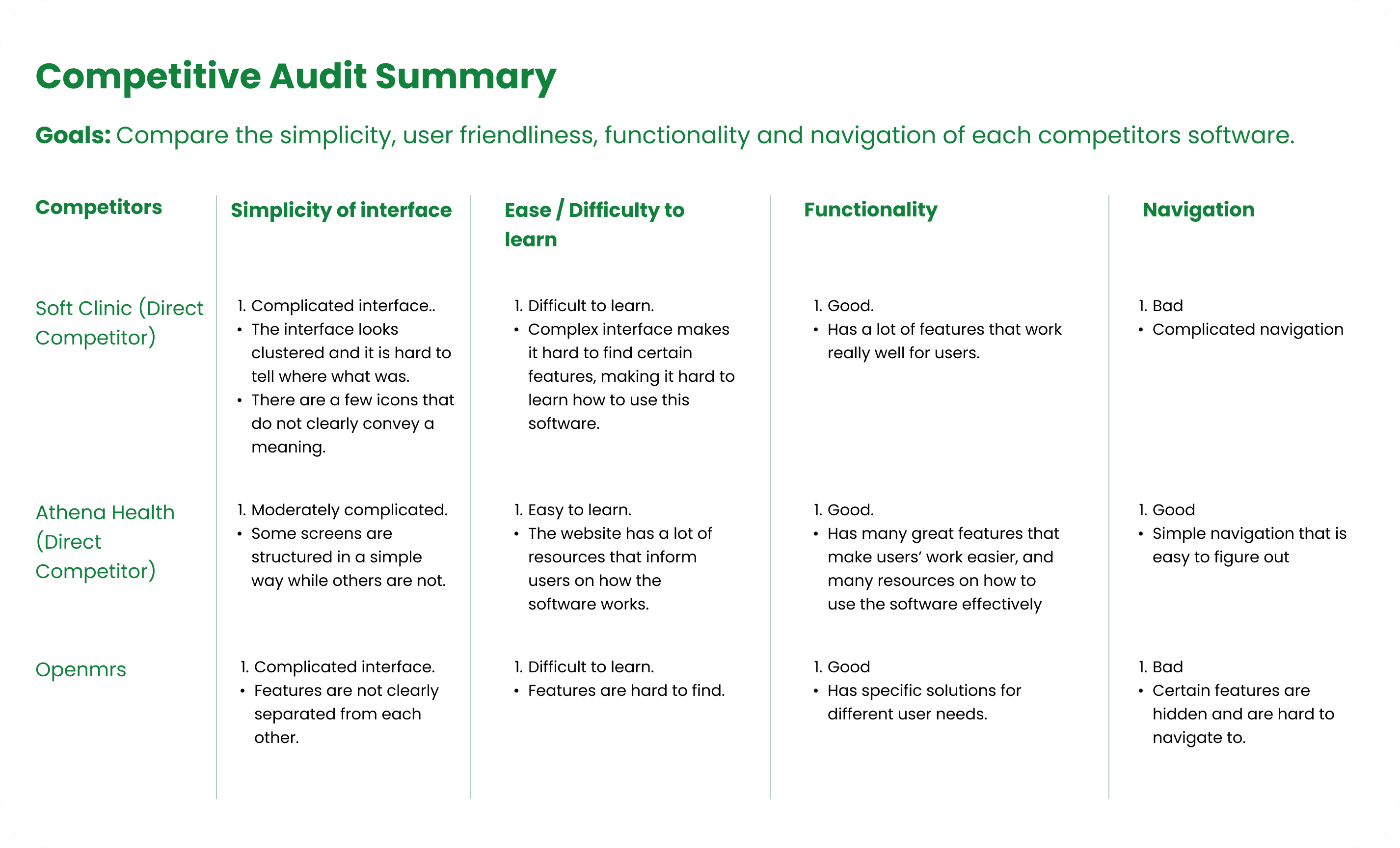 Competitive Audit I conducted a competitive audit to assess other software that provide hospital management functionality, to get a good understanding of the hospital management software market. This gave me a good understanding of the pain points users face when using most software in the market and the features of other software that users like. Thus, giving me a good idea of the features and characteristics I should include in my design to address user pain points, and design an interface users would like to use. Below is a summarized version of a competitive audit I conducted which highlights key areas.